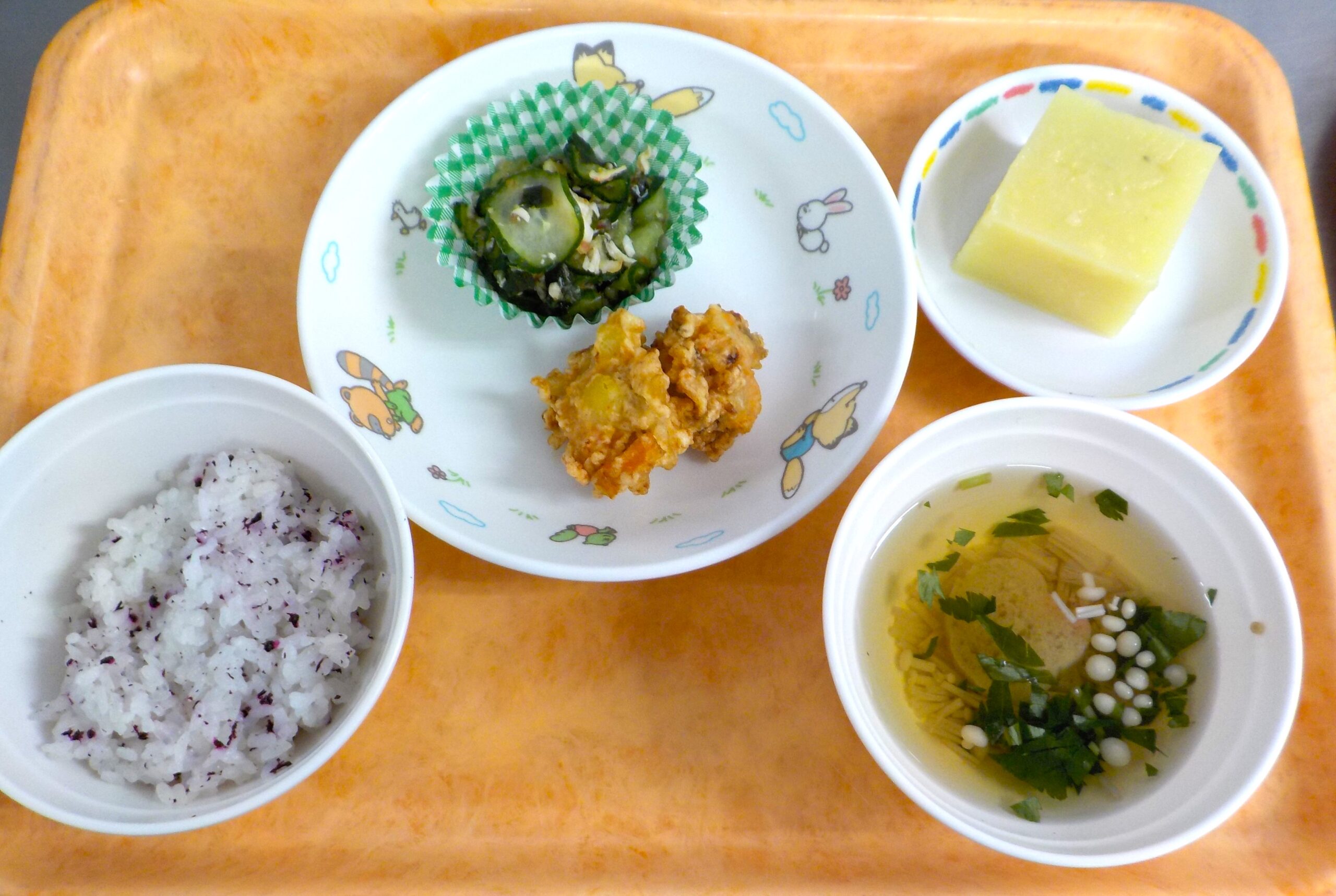 News & Topics Top News & Topics 11月7日(金)の給食 ★ 今日のメニュー ★ ゆかりごはん、かき揚げ天、かにの酢の物、すまし汁 手作りおやつはいもようかんです。 年長さんが掘ってきたさつまいもを使用しました♪ 今日も美味しく仕上がりました☆彡 2025.11.07 本日の給食