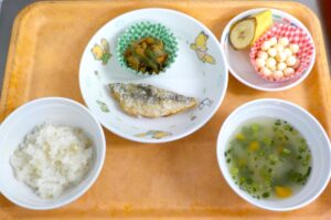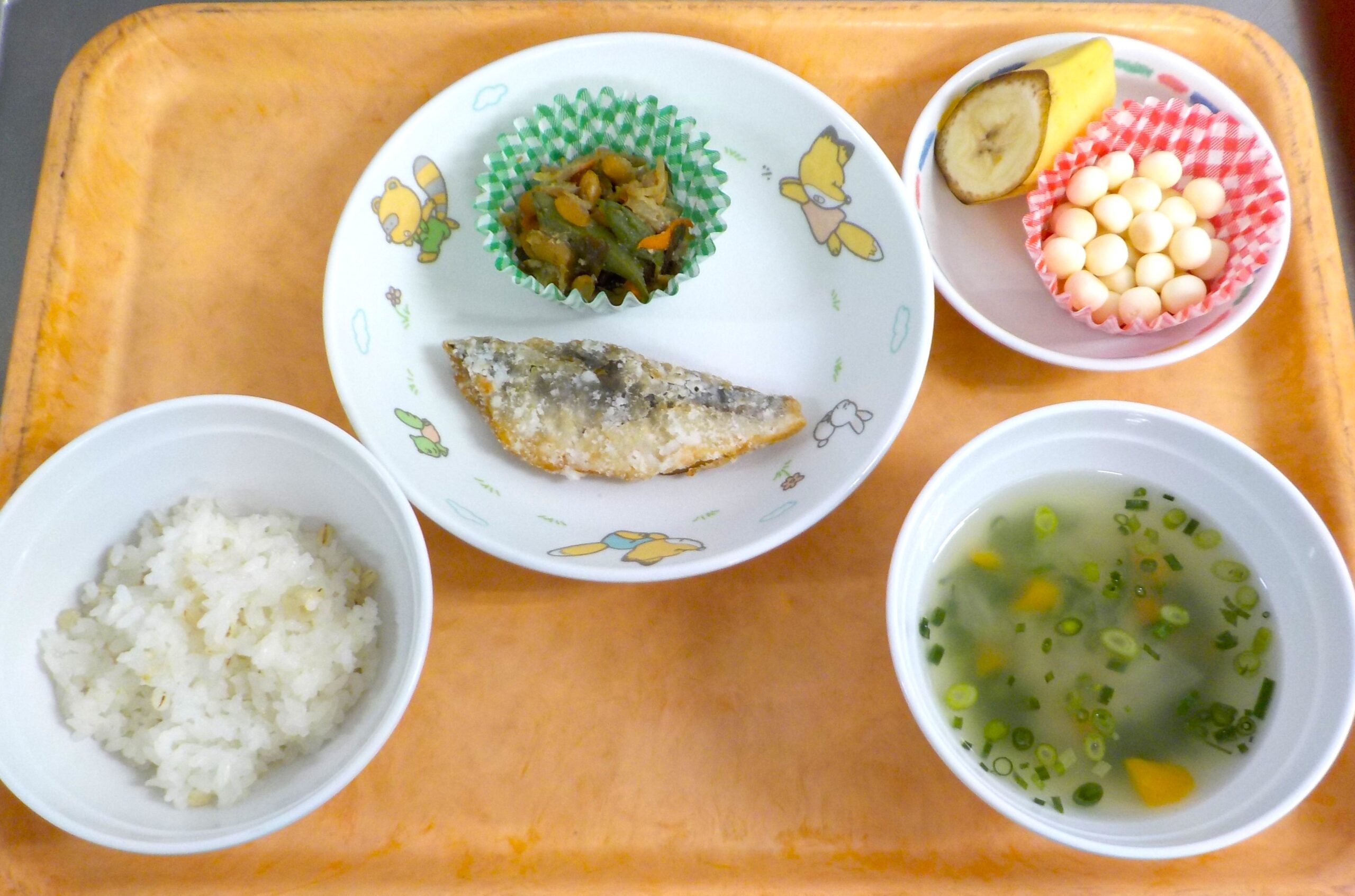 News & Topics Top News & Topics 11月18日(火)の給食 ★ 今日のメニュー ★ 麦ごはん、あじの竜田揚げ、大豆と鶏肉の煮物、みそ汁、 おやつはたまごボーロとバナナです。 今日も美味しく仕上がりました♪ 2025.11.18 本日の給食