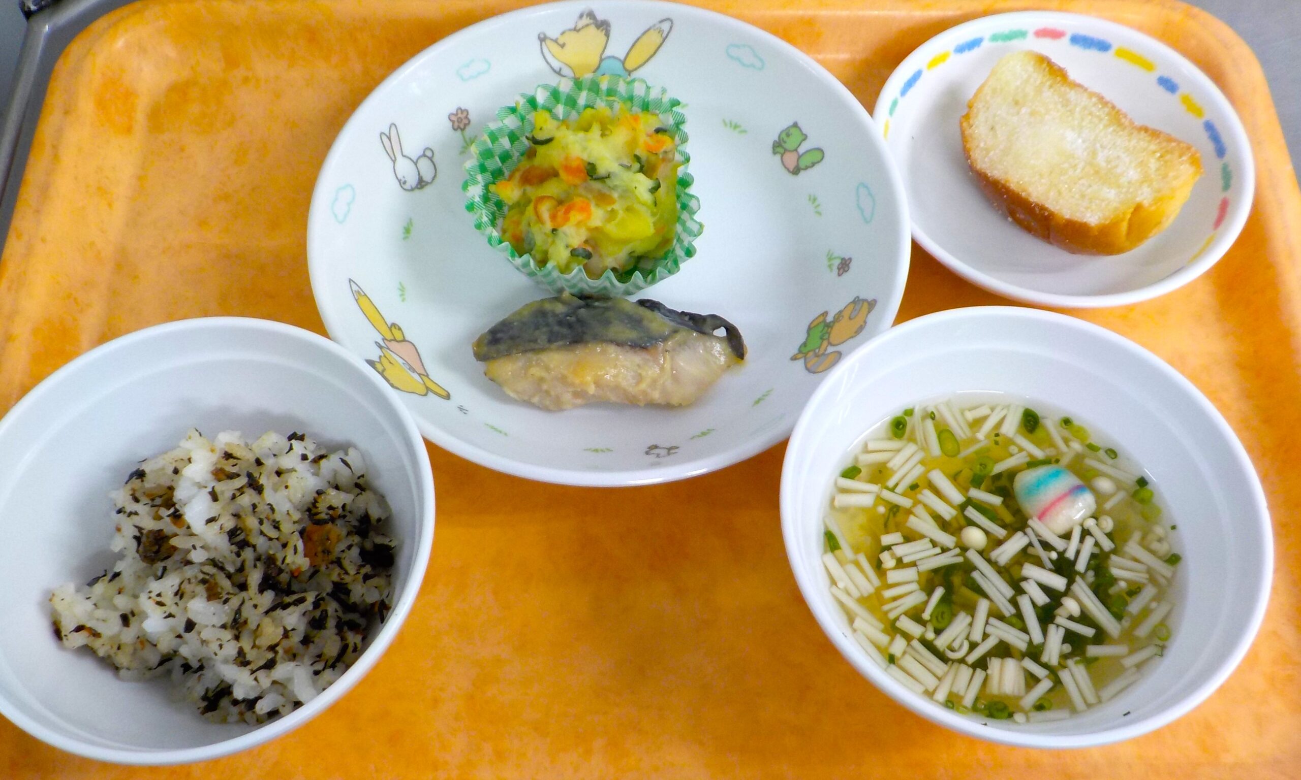 ひじきご飯、さわらの西京漬け、さつまいもサラダ、すまし汁