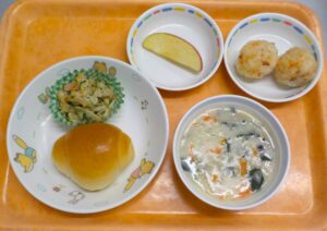 News & Topics Top News & Topics 12月17日(水)の給食 ★今日のメニュー★ ロールパン、冬野菜のクリームシチュー、ごぼうサラダ、りんご、 手作りおやつは切干大根のおにぎりです。 今日のクリームシチューのじゃがいもは 年少さんが掘ってきたものを使用しました♪ 2025.12.17 本日の給食