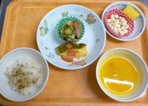 News & Topics Top News & Topics 12月22日(月)の給食 ★ 今日のメニュー ★ ふりかけごはん、カレイのピカタ(オーロラソース)、 和風サラダ、かぼちゃスープ おやつはたまごボーロとバナナです。 今日も美味しく仕上がりました♪ 2025.12.22 本日の給食