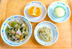 五目うどん、バンバンジー、みかん