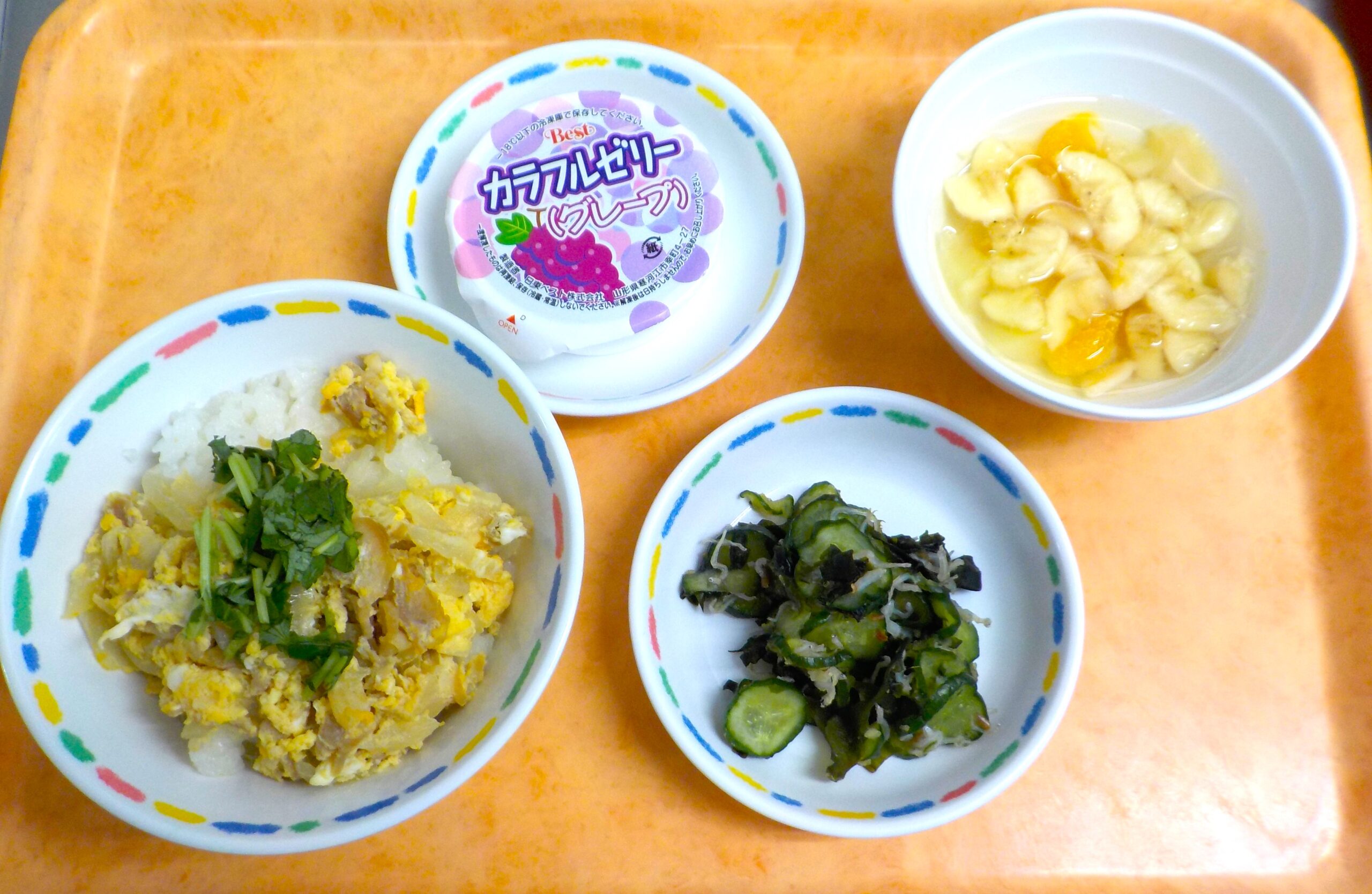 News & Topics Top News & Topics 1月14日(水)の給食 ★ 今日のメニュー ★ 親子丼、きゅうりとシラスの酢の物、ぶどうゼリー 手作りおやつはフルーツポンチです。 今日も美味しく仕上がりました♪ 2026.01.14 本日の給食