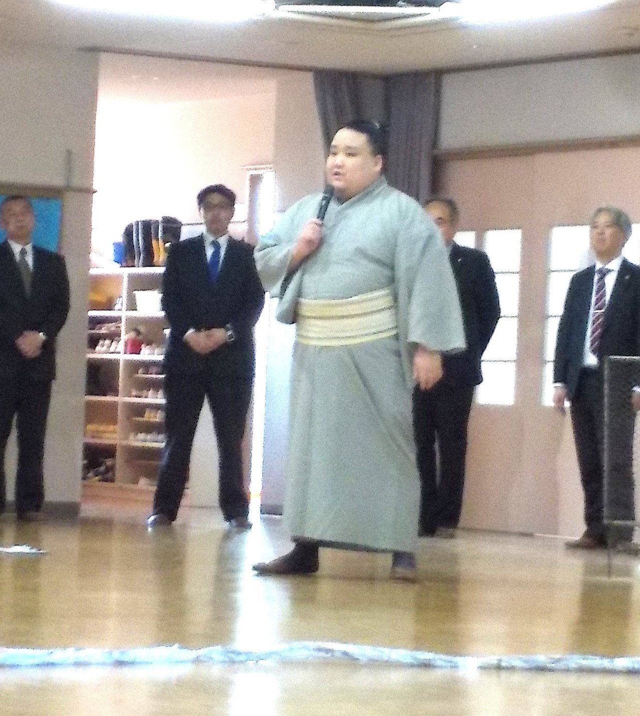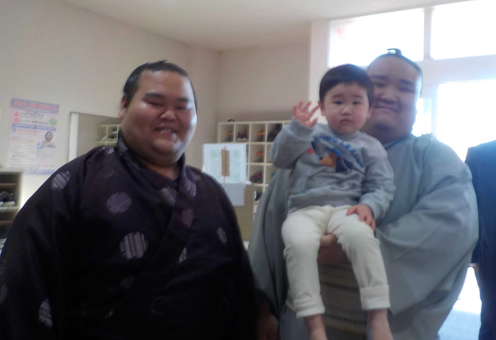 1月26日の夕方に力士の風賢央さんが来園されました。初めて見る力士の大きさにビックリしてた子ども達です。