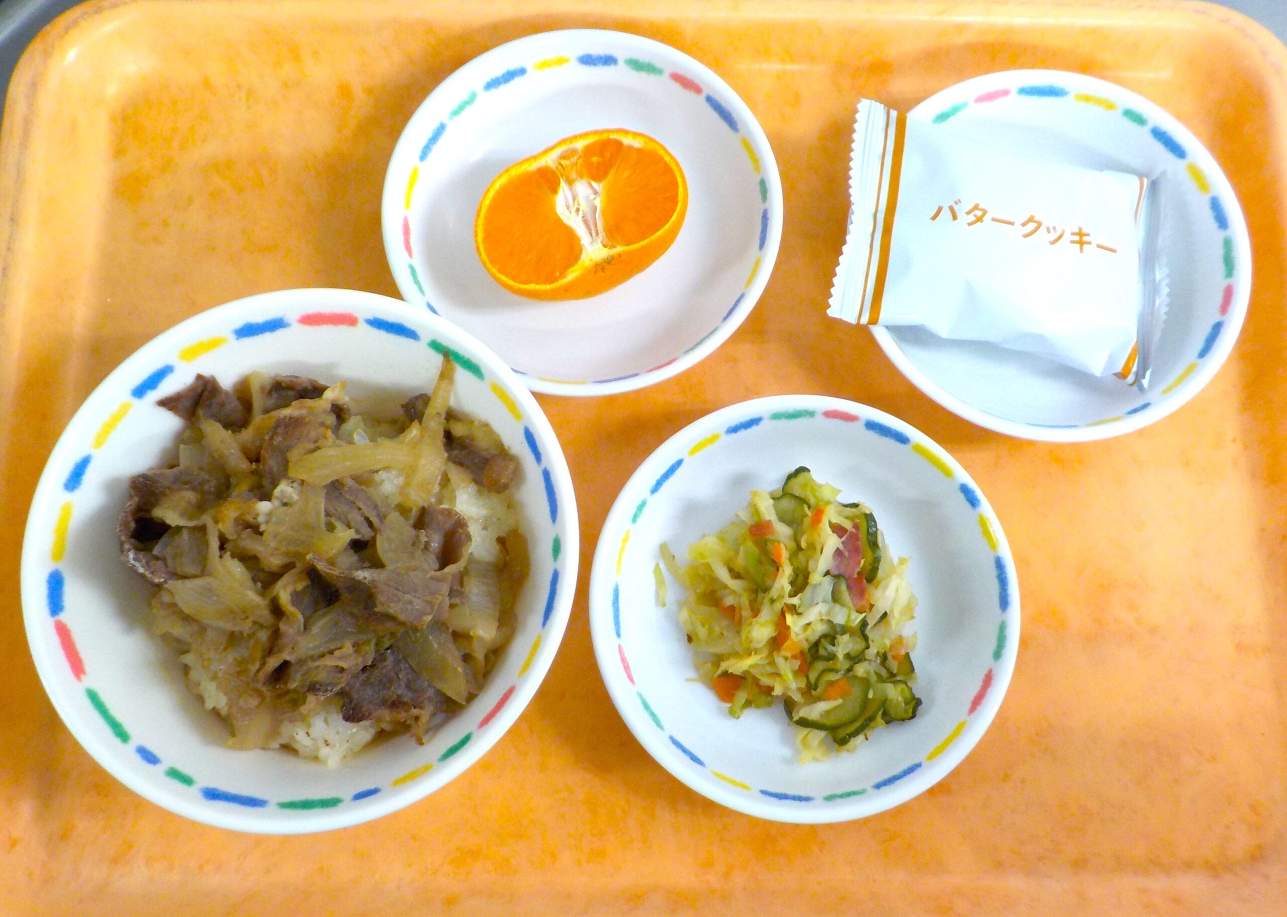 News & Topics Top News & Topics 1月28日(水)の給食 ★ 今日のメニュー ★ 牛丼、和風サラダ、みかん おやつはバタークッキーです。 今日も美味しく仕上がりました♪ 2026.01.28 本日の給食