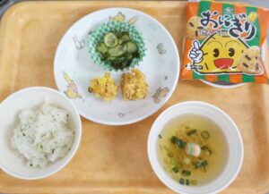 News & Topics Top News & Topics 2月2日(月)の給食 ★ 今日のメニュー ★ 菜めし、かき揚げ天、リンゴ酢あえ、すまし汁 おやつはおにぎりせんべいです。 今日も美味しく仕上がりました♪ 2026.02.02 本日の給食