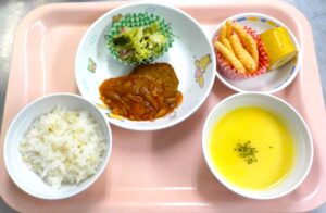 News & Topics Top News & Topics 2月9日(月)の給食 ★ 今日のメニュー ★ 麦ごはん、ハンバーグ、グリーンサラダ、コーンスープ おやつはかっぱえびせんとバナナです。 今日も美味しく仕上がりました♪ 2026.02.09 本日の給食