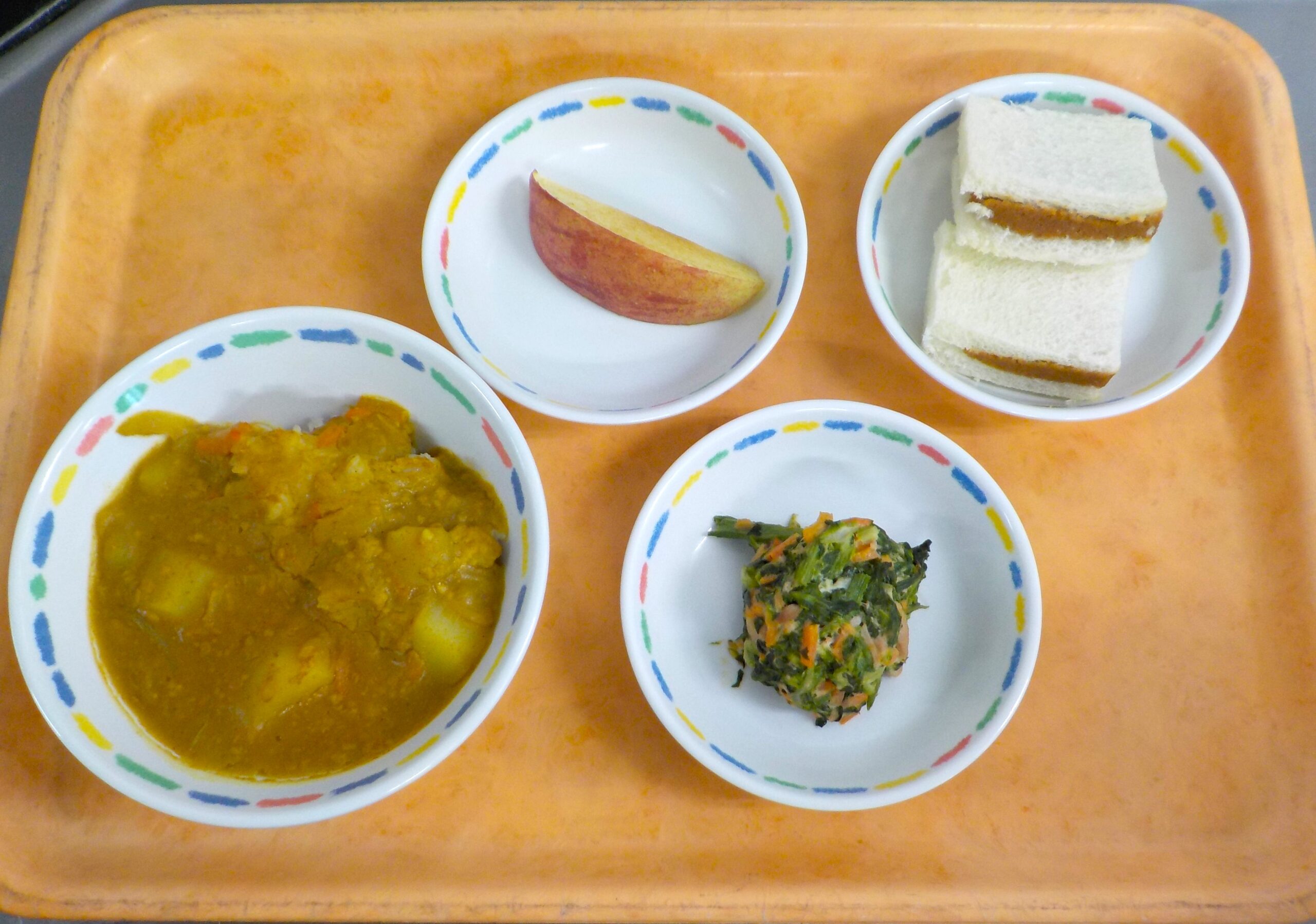 News & Topics Top News & Topics 3月13日(金)の給食 ★ 今日のメニュー ★ ポークカレー、菜の花のツナマヨ和え、りんご 手作りおやつはきなこトーストです。 (写真は未満児用のきなこトーストです。) 今日も美味しく仕上がりました♪ 2026.03.13 本日の給食