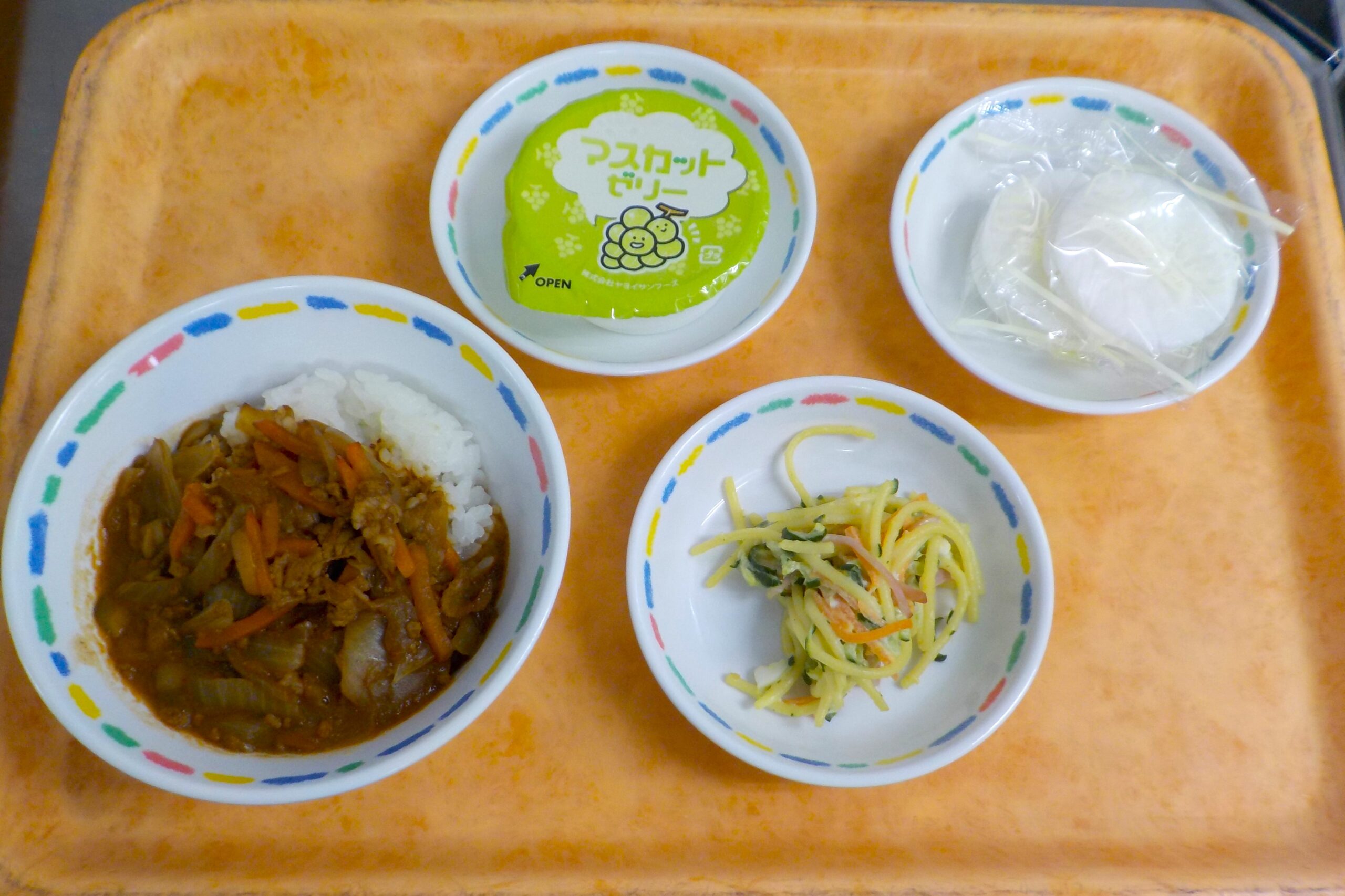 News & Topics Top News & Topics 4月13日(月)の給食 ★ 今日のメニュー ★ ハヤシライス、スパゲティサラダ、マスカットゼリー おやつは白い風船です。 今日から全給食が始まりました♪ 初めての環境でもよく食べていました☆彡 2026.04.13 本日の給食