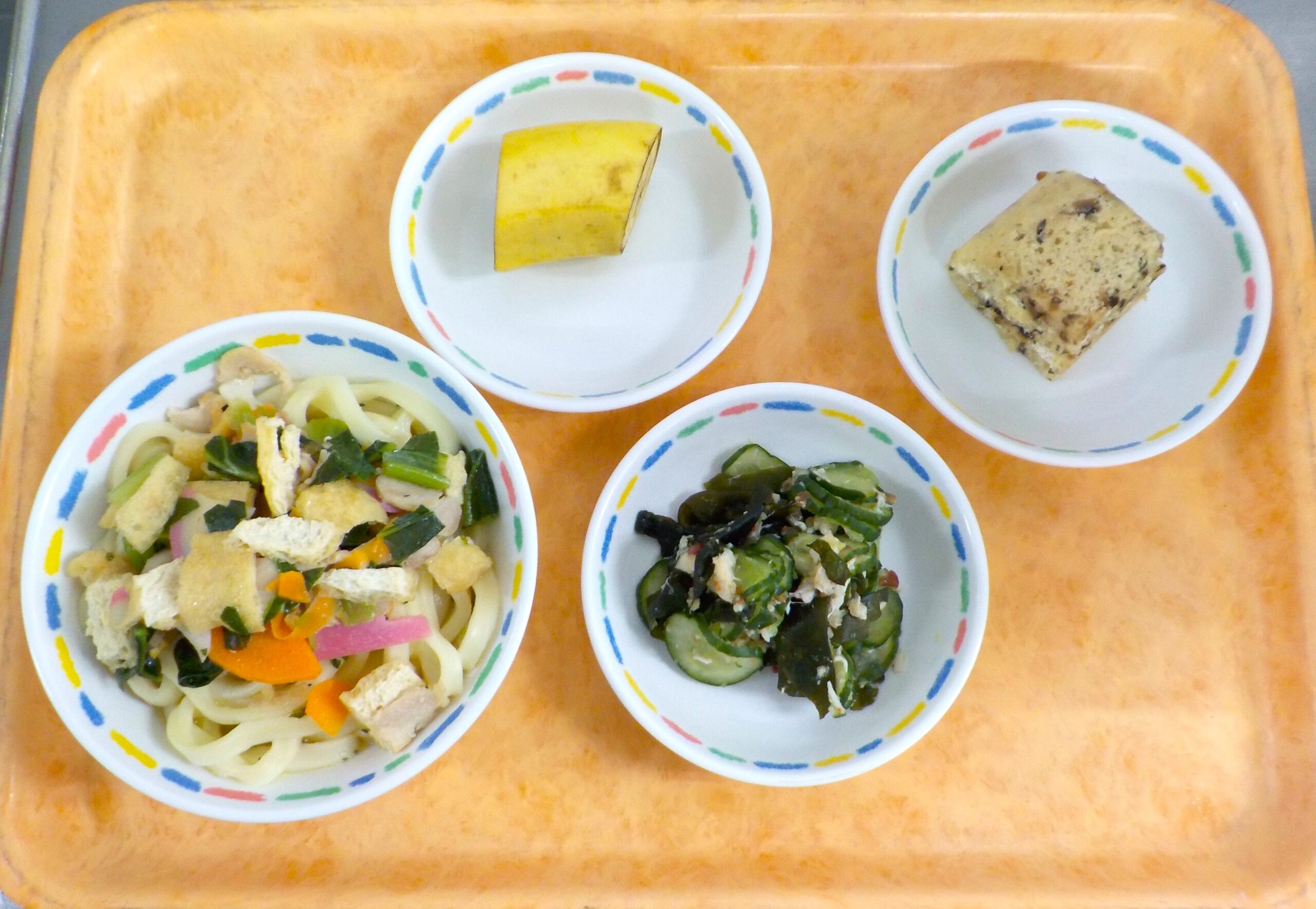 News & Topics Top News & Topics 4月17日(金)の給食 ★ 今日のメニュー ★ 五目うどん、かにの酢の物、バナナ おやつは黒豆蒸しパンです。 今日も美味しく仕上がりました♪ 2026.04.17 本日の給食